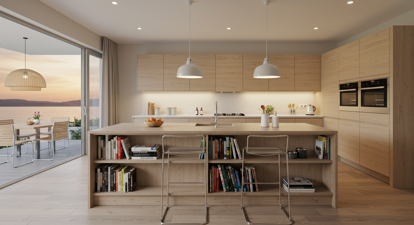 Luxurious finishes and fixtures offer a modern complement to the Old Florida beauty of the buildings and landscape. The spacious main home offers an elegant resort aesthetic with arched windows, neutral tones, recessed lighting and dark wood floors in the primary living spaces. In the kitchen, Porcelanosa tile flooring complements the bespoke, frameless wood-grain cabinetry and pale Caesarstone countertops. A massive island is a chef’s dream, with abundant space for prep plus seating adjacent to the den. Top-of-the-line appliances include a Sub-Zero refrigerator, Miele dishwasher, Wolf ovens and gas cooktop.